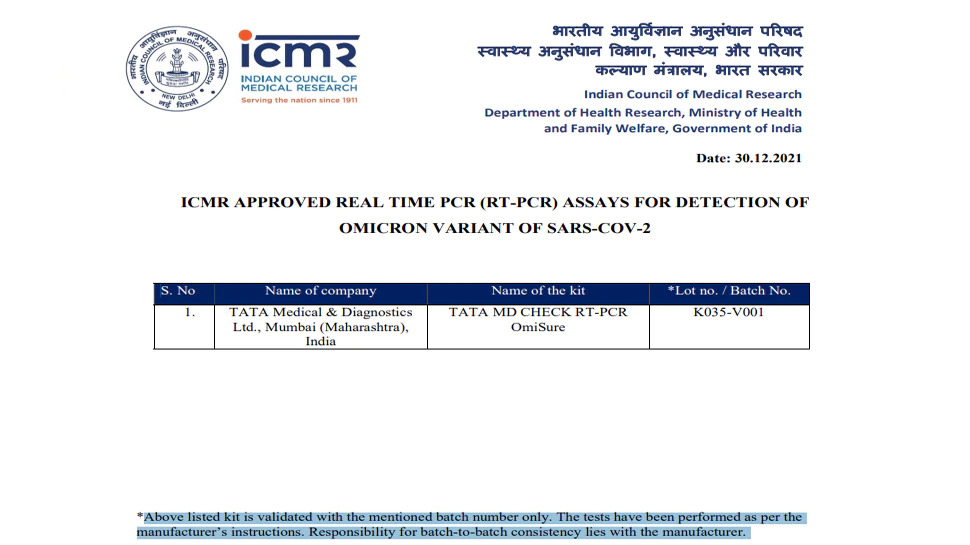 Meanwhile, the Medical Research Council of india (ECI) has approved the OmiSure, a unique OMICR diagnostic test kit developed by Tata Medical and Diagnostic Company, a mumbai - based company. The approval for this was given on december 30 last year. Tata's new testing kit is expected to be able to quickly diagnose omicron infection with ICMR approval. It is expected to add strength to the healthcare industry's action against omicron.