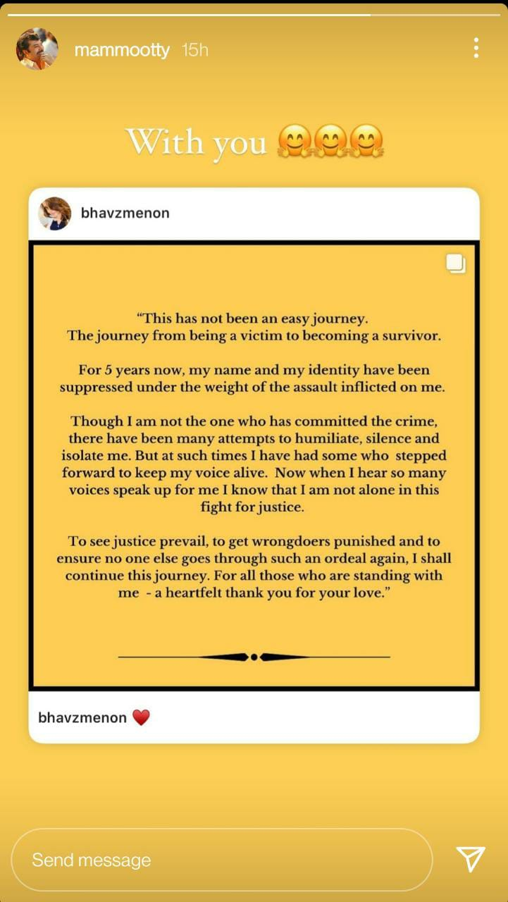 Many well-known people in and out of the film business have shown their support for the survivor and praised her bravery. Following the survivor's public speech, malayalam film actors mammootty and mohanlal also showed their support for him. Bhavna issued a statement on instagram on january 10 that stated, "This has been a tough road. The transformation from a sufferer to a conqueror.
