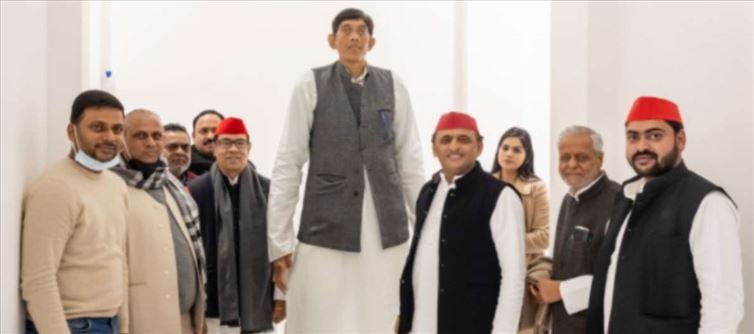 Dharmendra Pratap Singh, the world's tallest man, entered the Samajwadi party on january 22 in the company of party leader Akhilesh Yadav, just a few days before the Uttar Pradesh assembly polls in 2022. "Dharmendra Pratap Singh of Pratapgarh gained admission in the Samajwadi party while showing trust in the Samajwadi Party's platform and Akhilesh Yadav's administration," the Samajwadi Party's official twitter account tweeted.