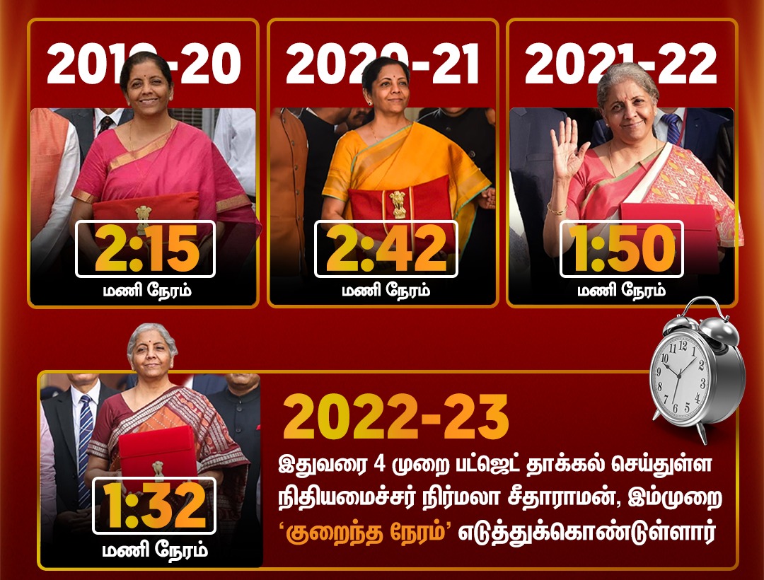 Finance minister nirmala sitharaman had already made history by delivering the longest speech in Budget two years ago. This year's Budget is the fourth time budget by Nirmala Sitharaman. Her Longest speech in that budget was about 2 hours and 40 minutes. nirmala sitharaman has wrapped up her Budget speech this time(2022) in about 1 hour 32 minutes which is her shortest one in her four-time Budget speech.