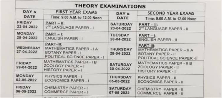 జేఈఈ మెయిన్స్ షెడ్యూల్ ప్రకటించిన కారణంగా.. తెలంగాణలో ఇంటర్ పరీక్షల షెడ్యూల్‌లో మార్పులు చోటు చేసుకున్నాయి. ఏప్రిల్ 21న జేఈఈ మెయిన్‌ వల్ల ఇంటర్‌ షెడ్యూల్‌లో మార్పులు చేస్తున్నట్టు తెలంగాణ ఇంటర్ బోర్డు ప్రకటించింది. మార్చిన షెడ్యూల్ ప్రకారం ఏప్రిల్ 22 నుంచి మే 11 వరకు ఇంటర్ మొదటి సంవత్సరం పరీక్షలు జరుగుతాయి. అలాగే ఏప్రిల్ 23 నుంచి మే 12 వరకు ఇంటర్ రెండో సంవత్సరం పరీక్షలు జరుగుతాయి.