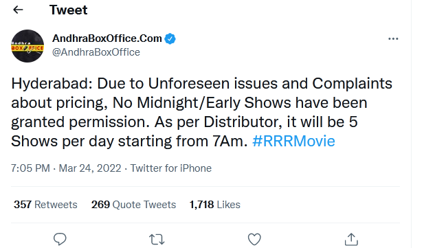 It is noteworthy that the move to raise rrr ticket prices in telangana came after the government announced revised fares for movie tickets in december 2021. andhra pradesh also announced new ticket prices on march 8.
