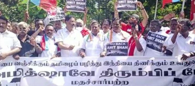 They then screamed anti-Hindi dump chants and demanded the return of amit shah, who had failed to deliver on his election pledges. They waved black flags and chanted, "Go back, amit Shaw, go back, don't push, don't push, don't push, don't push India." The police then grabbed the black flag they were waving. This resulted in a tense standoff between demonstrators and police. Those wearing black shirts were also detained by the police. On both sides, this created a hostile environment. Black clothes and black flags are not permitted, according to the police. The black flags were then removed from the area. The demonstrators were still being evacuated by the police.