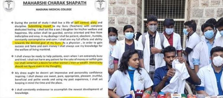 The sanskrit Pledge, which was accepted by first-year students of the madurai Government Medical college in english, sparked debate because it included ideas such as maintaining devotion and discipline in life, wholehearted dedication to teachers, not giving place to female desire and lust, and only treating women in the presence of the husband.