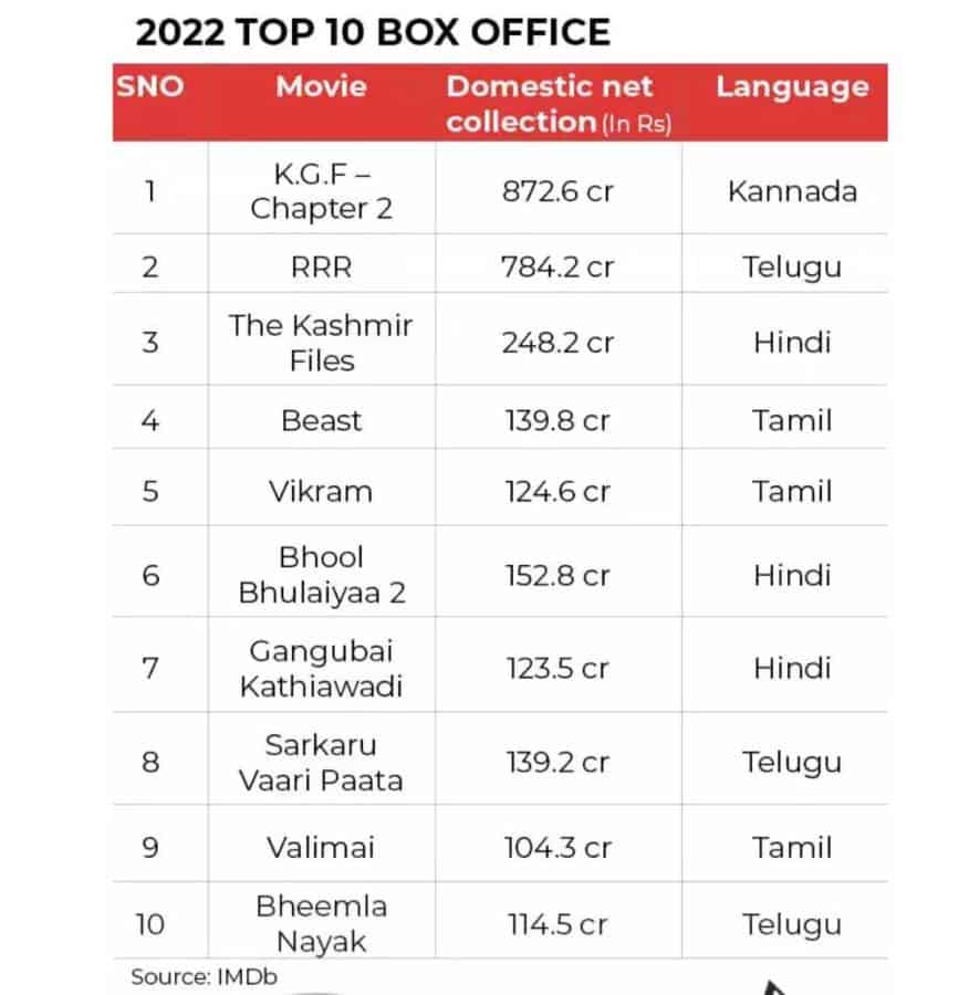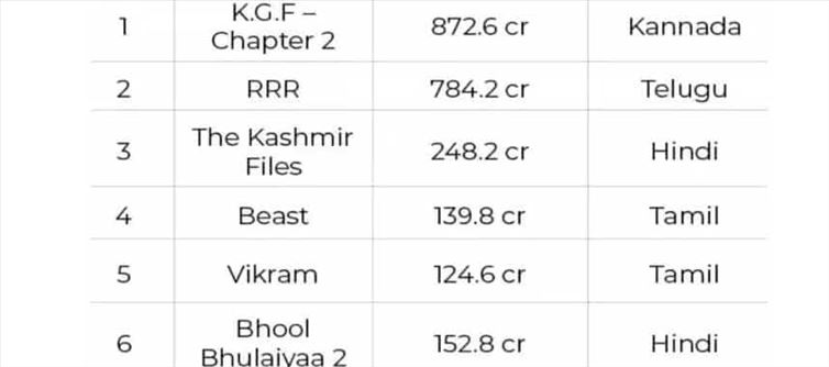 A large news daily just published a report on the year's top hits, and unexpectedly, the majority of them are pan-India action pictures. Almost all of the films that have grossed a lot of money at the box office have solid tales with action components and no woke female-oriented plots.The public has expressed their want to see larger-than-life stories when they arrive in theatres, according to the report. All of the films are from the South, with the exception of The kashmir Files, Bhool Bhulaiyya 2, and Gangubai.