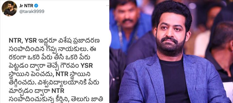 He continued, "One cannot erase the respect and reputation won by ntr, his place in the history of telugu land, and his memory in the hearts of telugu people, by altering the name of the university. The remark made it evident that Jr. ntr is reluctant to criticise the jagan government for deciding to rebrand ntr University as ysr University.