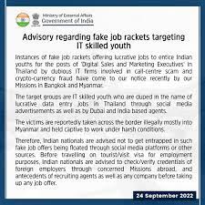 The Ministry of External Affairs said that lucrative job offers are being offered to woo indian youth for 'Digital Sales and Marketing Executive' positions in thailand and Myanmar. These rackets are being operated by call centres and IT firms suspected of cryptocurrency fraud.