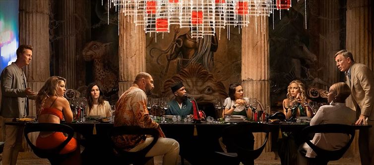 A computer billionaire with many ideas, Miles Bron (Edward Norton), invites his friends to his private Greek island for a weekend of pleasure and a murder mystery he created. His buddies are, to put it mildly, a diverse group. Model Birdie (Kate Hudson) frequently posts offensive things on social media, which prompts her assistant Peg (Jessica Henwick) to confiscate her phone in order to prevent further incriminating evidence. Miles is funding Claire (Kathryn Hahn), a politician, and Lionel (Leslie Odom Jr.), a tech expert, to work on Miles' crazy ideas that he faxes to him in the middle of the night.