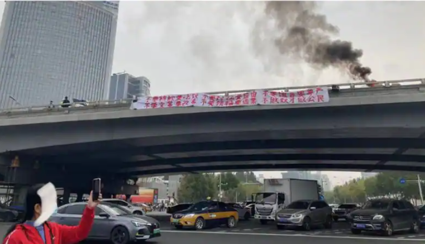 On the one hand, however, on the other hand, there are protests in beijing against the President. Protesters have been showing their opposition by hanging banners calling for the impeachment of Chinese President Xi jinping in many places in Beijing.