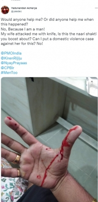 Can somebody assist me? Or did someone assist me when this occurred? No, I'm a dude, so no! I was knifed by my wife; is this the naari shakti you extol? Can I file a complaint of domestic abuse against her for this? No! He said that his wife had stabbed him, causing blood to come from his hand. In response to his post, Bengaluru police Commissioner Pratap reddy advised him to come to the station, file a complaint, and seek legal counsel. Yadunandan acharya has garnered support from all social groups and called attention to the problem of harassed husbands.He said that his wife had stabbed him, causing blood to come from his hand. In response to his post, Bengaluru police Commissioner Pratap reddy advised him to come to the station, file a complaint, and seek legal counsel. Yadunandan acharya has garnered support from all social groups and called attention to the problem of harassed husbands.