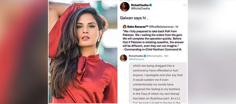 Richa responded to a tweet by Lt. Gen. upendra Dwivedi, commander of the Northern Army, in which he declared that the indian Army is prepared to carry out any instructions to retake Pakistan-occupied kashmir (PoK). Using her twitter account, Richa posted, "Galwan says hey." Richa was unnecessarily bringing grief to the Galwan Valley. 28 indian soldiers died earlier in Galwan while battling the Chinese forces. Richa mockingly tweeted something that is disrespectful to the indian army and hurts national feelings.