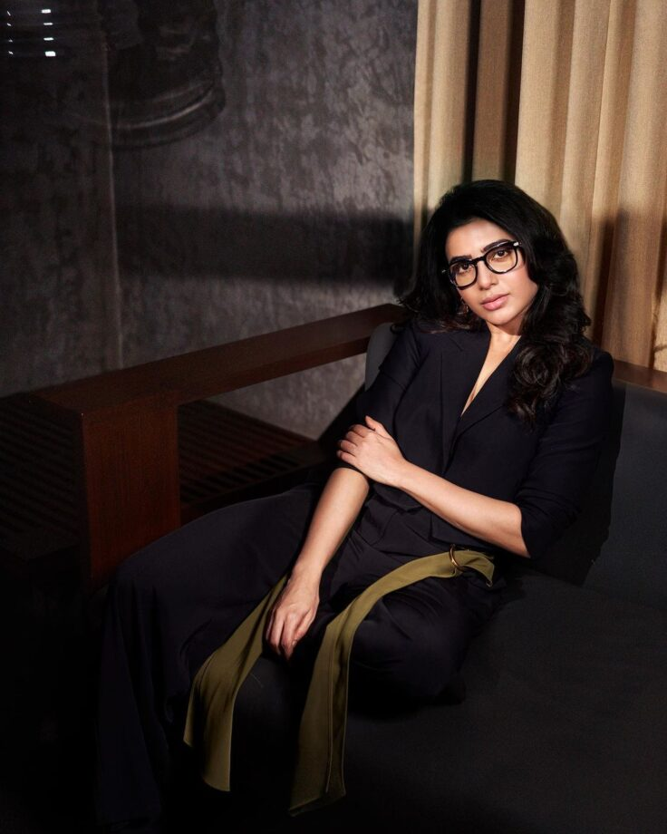 Samantha Ruth Prabhu has an elegant and straightforward demeanour. While the Oo Antava diva is always expected to embellish it with style and make it extravagant. samantha sported a three-piece outfit in black, consisting of a crop top, a cropped jacket, and flare pants. The transparent glasses also enhanced her appearance.