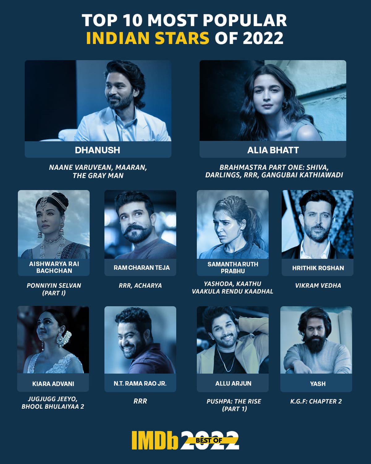 This year is just about to say goodbye. As the years go by, many things from the past come to mind. On the other hand, if we talk about the entertainment world, today we are going to tell you which celebs were in the headlines among fans this year. South films dominated throughout the year, so it is obvious that only South stars have won in this list. Actor dhanush has won the list of 10 most famous stars of 2022. The interesting thing is that alia bhatt and aishwarya rai bachchan have made it to this list.