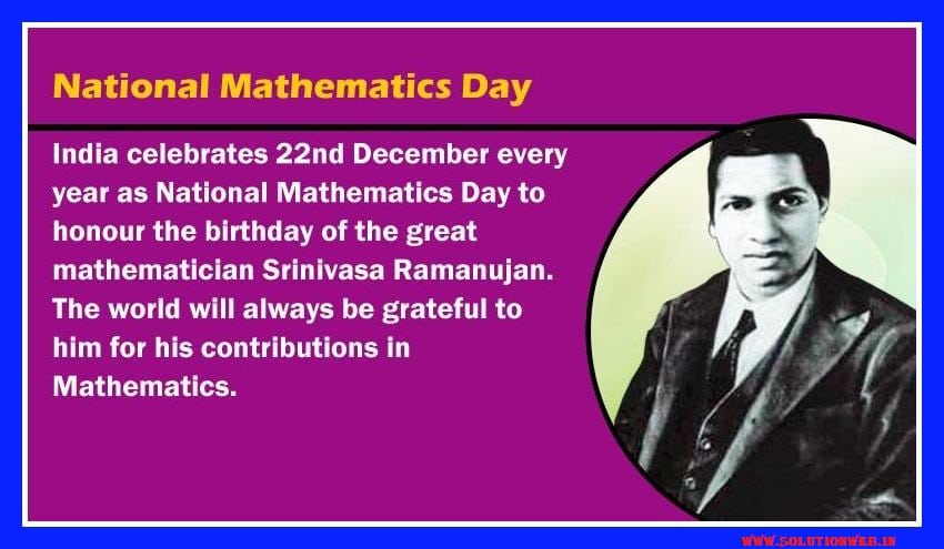 To commemorate the great mathematician Srinivasa Ramanujan's birth anniversary, National Mathematics Day is observed every year on december 22. He was born in 1887 to a lowly Iyengar Brahmin family in Erode, tamil Nadu.