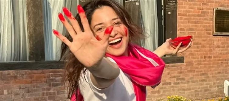 Holi is being observed by tamannaah bhatia in Nepal. The actress posted a few pictures of herself having a good time at Holi. She is all cheerful and has red color on her cheeks while wearing a white ethnic suit and crimson dupatta. The actress maintains her usual beauty with minimal makeup.