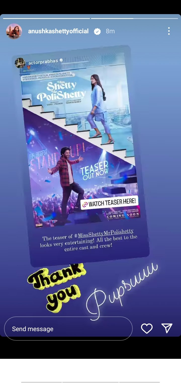 Prabhas responded to the teaser posted by Miss Shetty and Mr. Polishetty on Instagram. prabhas commented beside the official movie poster, "The trailer of #MissShettyMrPolishetty looks extremely fun! I wish the entire cast and crew the best. anushka shetty responded by calling him "Pupsuuu" as she expressed her gratitude. Darlings, naveen polishetty retorted. Annaya responds to the #MissShettyMrPolishetty teaser. I'm grateful to prabhas Annaya. I adore you, MSMP Teaser.Anushka Shetty is portrayed as a cook in the teaser, and naveen polishetty is shown as a stand-up comic. The preview advertises a fun-filled rom-com and is jam-packed with amusing dialogue. mahesh babu P is in charge of the much-awaited endeavor, which is made under the famed uv creations label. The production has senior actors Jayasudha, murali Sharma, and many others in key parts, in addition to anushka shetty and naveen Polishetty. The project's lyrics and original score were written by Radhan.