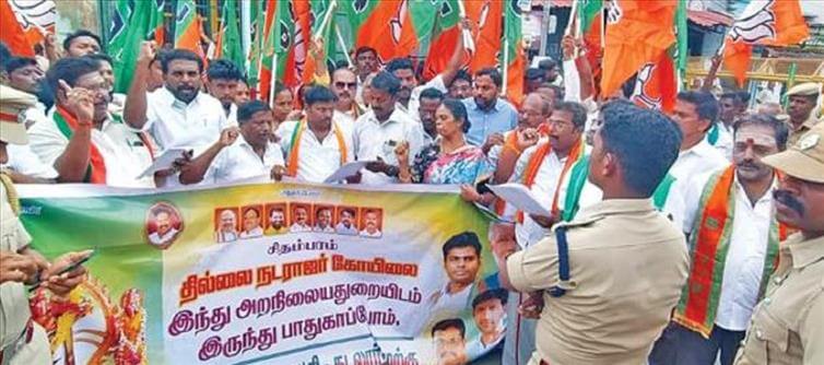 BJP protested in chidambaram in defiance of the police ban in support of the Dikshitars, condemning the Hindu Charities Department for worshiping on the Kanakasabha of the chidambaram Nataraja temple. police arrested 140 people including 12 women.