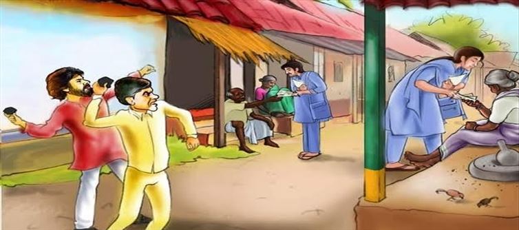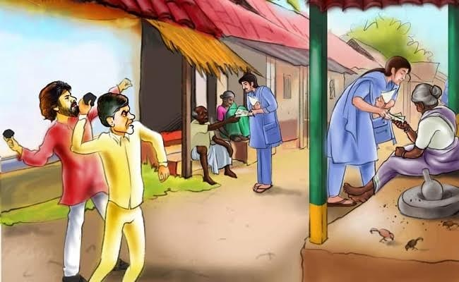 Yes... an artist recently painted a painting with photos of pawan kalyan Chandrababu Naidu. Chandrababu - pawan kalyan in this artwork is like throwing stones at the village volunteers! It is said that this pic will go viral. It is known that in every town and village of andhra pradesh, there are many elderly women who are receiving services from village/ward volunteers. And especially in the case of health surveys along with pension, comments are heard that their services are very valuable.But it is known that Pawan Kalyan - chandrababu naidu is pelting stones at these volunteers in that photo. At that time it appears that the volunteers are giving pensions to the old people who are sitting on the doorsteps of the house. With this... it is clear that the comments on the selfless volunteers are as if two people are trying to undermine the system for selfish politics.