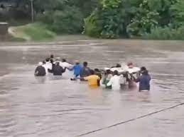 Due to the heavy rains in nirmal district, all the ponds have become full. In this way, heavy flood water entered the pond near Sirala village of Bainsa district. Even though it was completely filled, the dam of the pond was broken due to the flood water. As the flood water flooded the village, the villagers reached a hill in fear for their lives. About 200 people are hiding in the high area to save their lives. They are lying on the mound in a state of disorientation, soaking wet in the rain. After receiving the information from the villagers, the officials started rescue operations. Reaching the mound, the villagers are being evacuated to safer areas. The flood water is increasing and hampering the relief efforts. Meanwhile, a village drowned in Jayashankar Bhupalapalli district due to a flood disaster. Moranchapalli village was inundated with flood water and more than a thousand villagers were trapped in the water crisis. All the villagers spent their time hiding on top of houses, in high places, in trees, and holding their lives in their hands. people who woke up at around four o'clock in the morning on thursday woke up and screamed for their lives. They saved themselves by climbing on top of the houses to avoid being swept away by the floodwaters that entered the houses.Finally, army helicopters reached Moranchapalli and started relief operations. NDRF personnel also rescued the villagers with the help of boats. But some were washed away in the flood water and the others were saved and shifted to safer places.