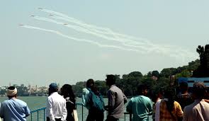 On saturday, september 30, the indian air Force's fighter jets performed an air display over Bhopal, the state capital of Madhya Pradesh, over the renowned Bada Pond. Astonishing acrobatic displays performed in the air by the valiant fighter pilots of the air Service enthralled thousands of onlookers. There are 65 fighter planes in the airshow, and women pilots have also flown some of them. fighter jets from Agra, Gwalior, and ghaziabad were circling acrobatically over Bhopal's large pond. people were particularly moved by the displays of the fighter planes Tejas, akash Ganga, Rudra, Badal, Shamsher, Trishul, Sarang, Jaguar, and surya Kiran.