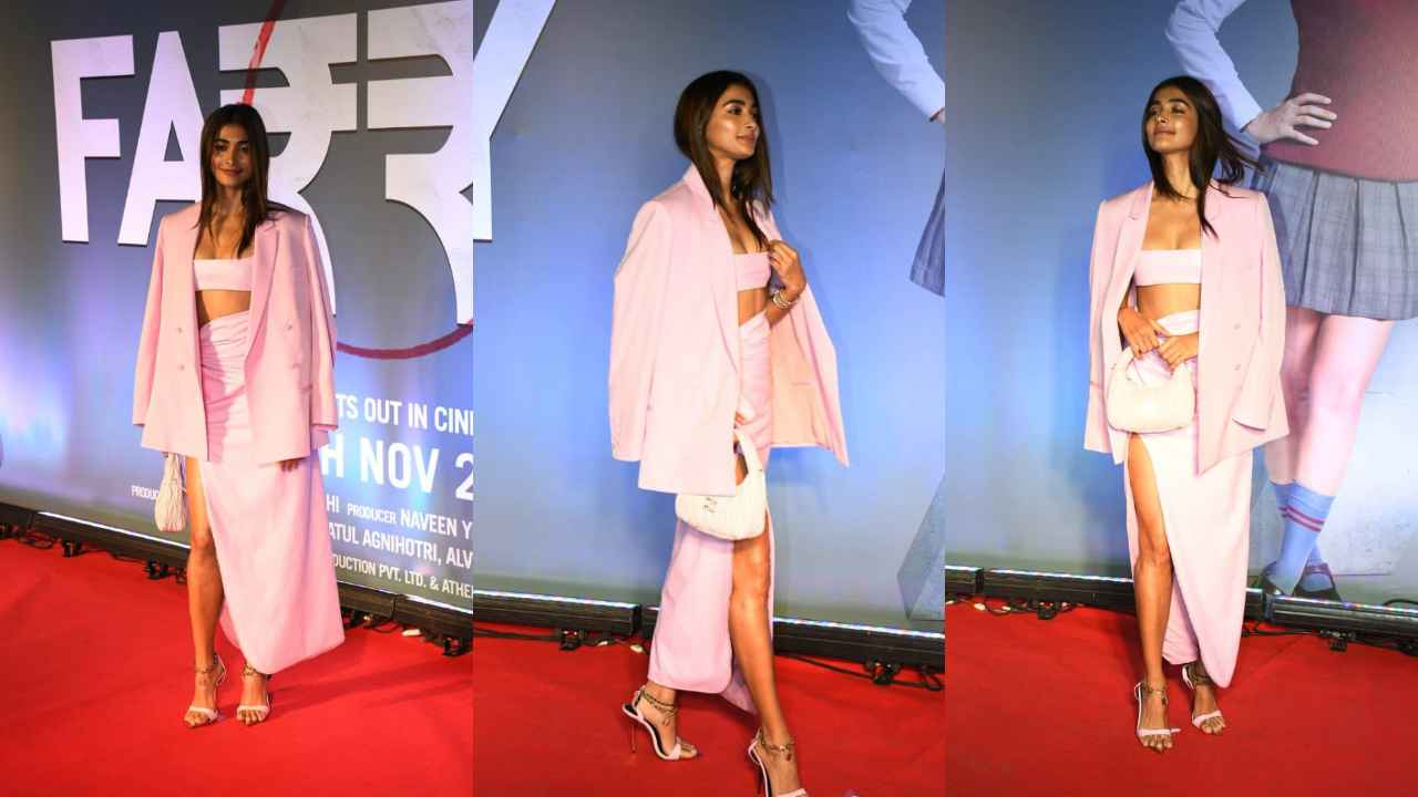 The stunning dress choices of the Kisi Ka Bhai Kisi Ki jaan actor have continually charmed spectators, and her current appearance is no exception. Her powder-pink co-ord set oozed a sleek boss-babe vibe, highlighting the enduring appeal of cotton candy hues. The outfit, which retailed for Rs. 17,500 for the fitting fake leather scoop bralette and Rs. 57,504 for the thigh-high slit faux leather sarong wrap skirt, added a fresh spin to seasonal clothing. The huge double-breasted fake leather wrap-style jacket, priced at Rs. 97,506, was what set the Beast actress' outfit apart, giving a touch of power dressing to her attire.