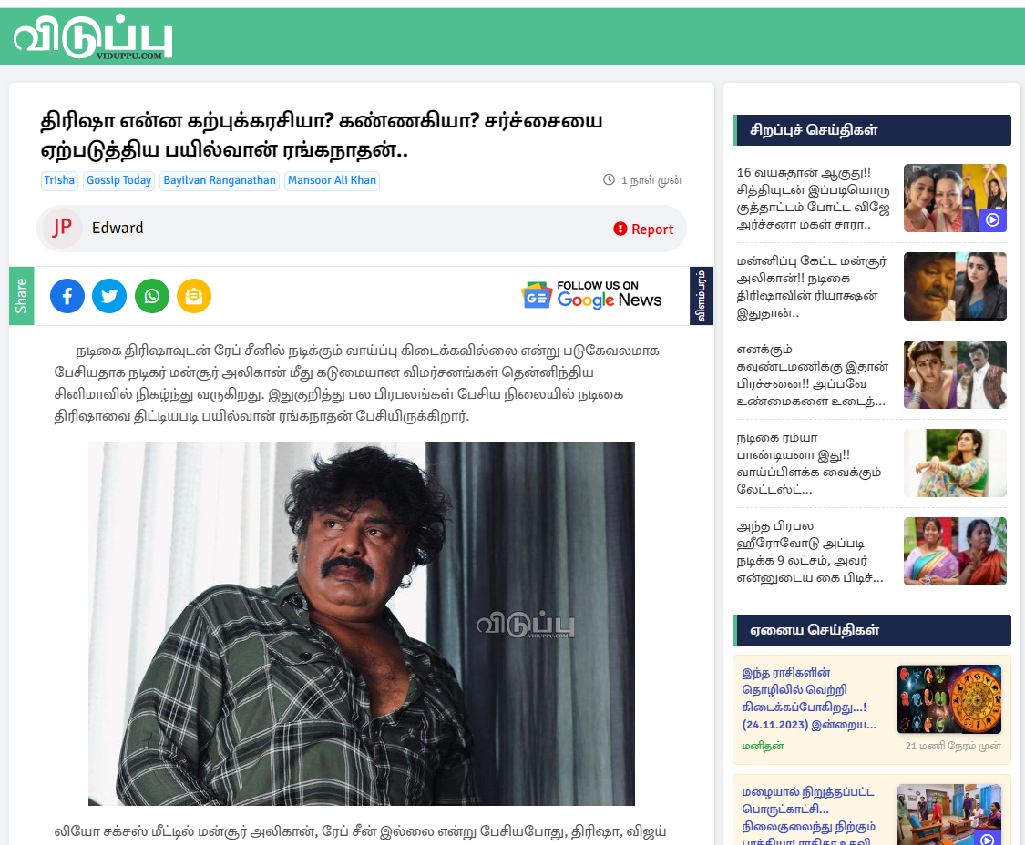 Trisha and Mansoor ali Khan's issue has finally subsided as Mansoor has apologized and trisha has accepted it with a statement on her social media account. However, a veteran actor who currently runs a YouTube channel has spoken in support of Mansoor and lashed out at her. This news was published in the tamil media portal 'Viduppu' and we have attached the screenshot below. He has questioned if trisha is a virgin and has spoken so cheaply on that video as per that article.