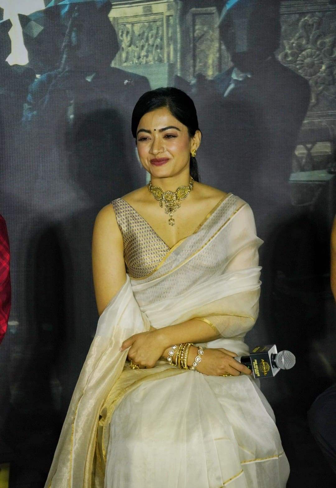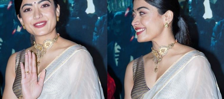 Rashmika Mandanna, lovingly known as National crush by her followers all around the world, has always been a fashion standout. She always looks stunning, whether she's wearing an airport smart outfit or a traditional saree. Rashmika's latest saree appearance at a press event for her forthcoming flick Animal in hyderabad has gotten a lot of notice. The Pushpa: The Rise star wore a stunning kerala Banarasi woven organza silk saree with a contrasting gold border. She wore it with a sleeveless brocade blouse.