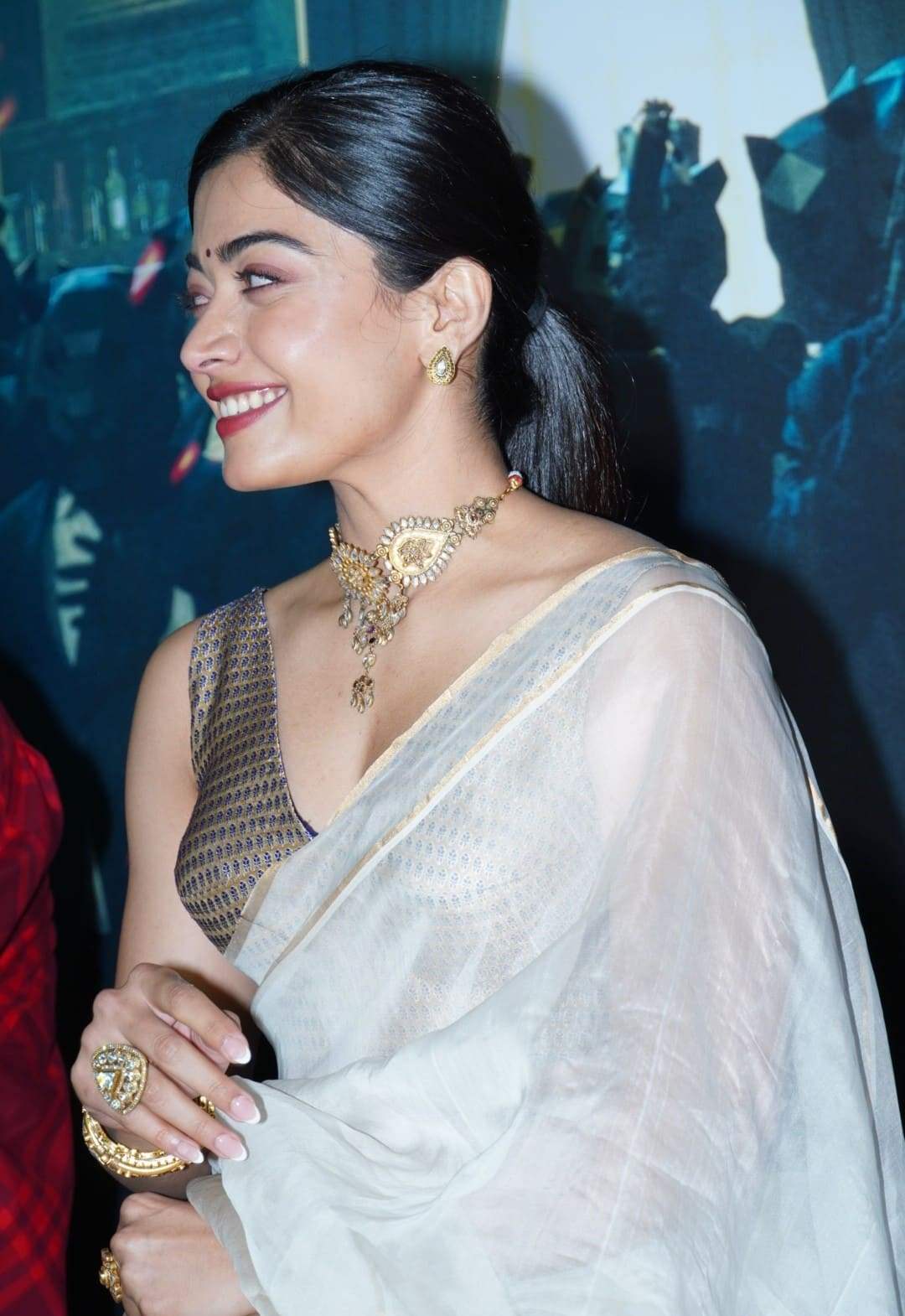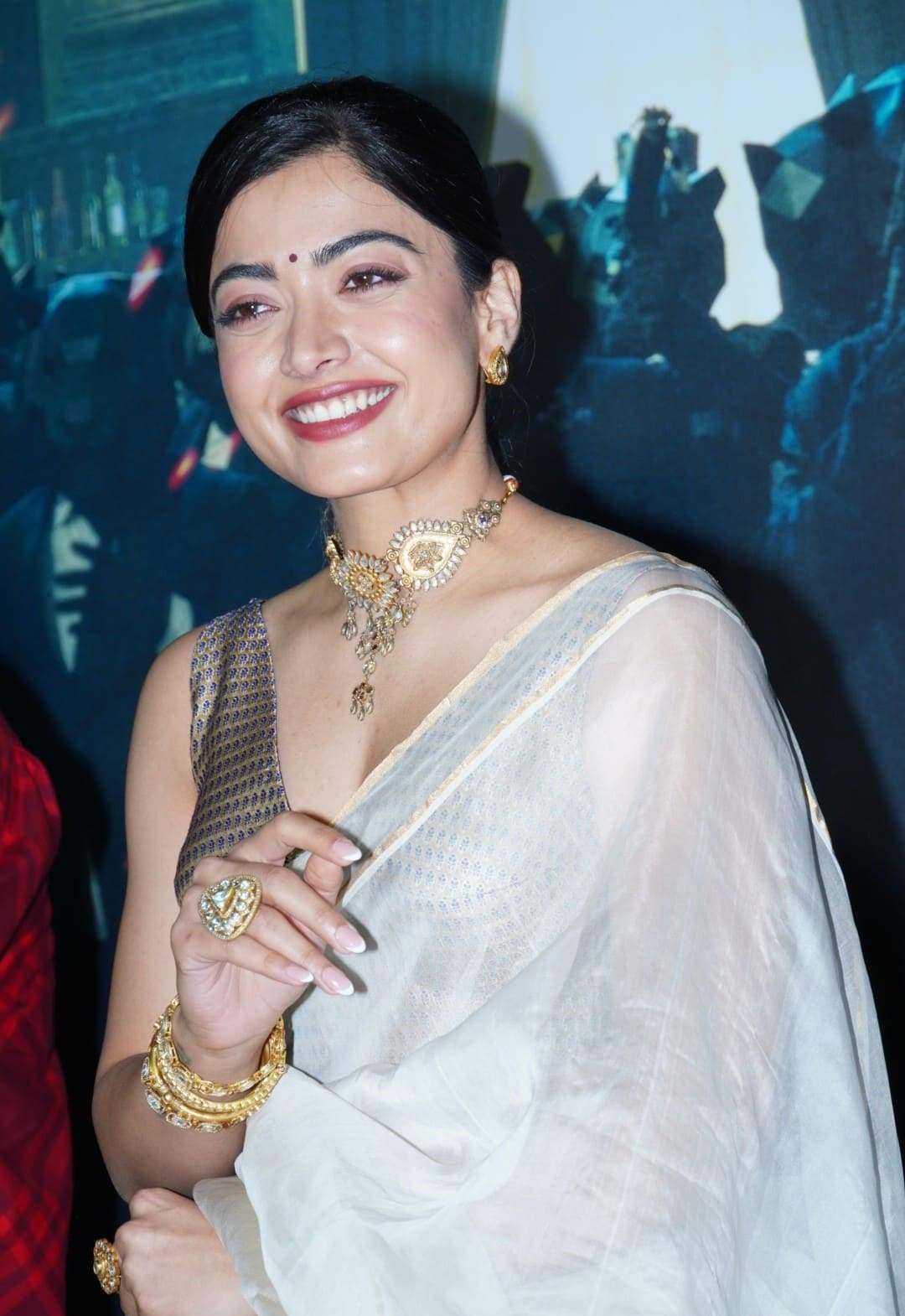 Rashmika accessorized her ensemble with striking jewelry, including a gold neck choker, white stone bangles, massive gold stud earrings, and giant display rings. The Mission majnu actress complemented her traditional look with bright lipstick and a modest ponytail. rashmika mandanna is well-known for her immaculate sense of style and ability to pull off any look flawlessly. Her new saree ensemble is just another proof of her fashion acumen.