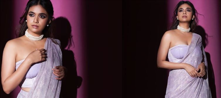Keerthy suresh embraces the lavender love in a sequin shimmer saree from the stores of Monika Nidhi, styled by the wonderful combination of rashmi Angara Vashisht and Archa Mehta. She ups the glam factor by wearing a strapless corset blouse with her saree.