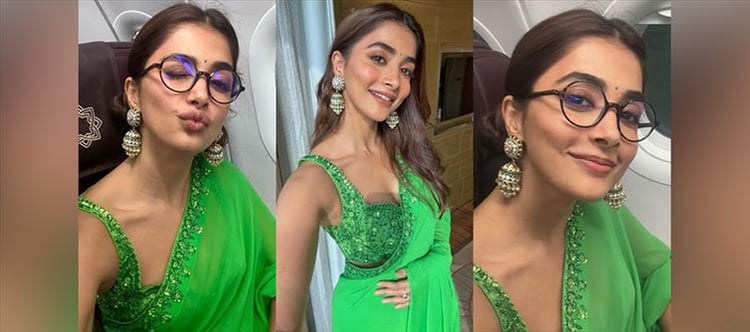 Pooja Hegde's wardrobe exudes elegance and regal appeal. Her saree diaries frequently match the summer and winter theme boards, which impresses us. The diva recently gave a splash of color to the dreary and grey winter season, dressed in a vivid green saree. It's safe to say she vanquished our chilly morning blues in a flash. The gorgeous green six-yard marvel has finely embroidered borders and sherry tassel trimming down the pallu.