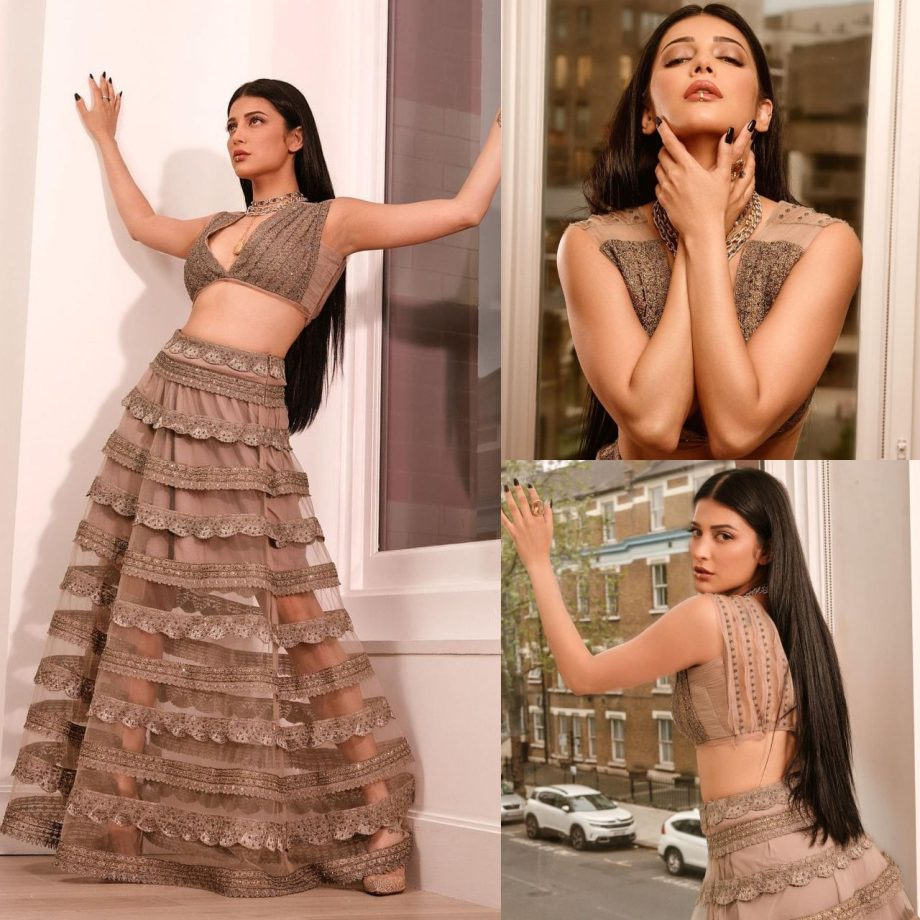 Shruti Haasan stands out in a coffee-colored lehenga, which she pairs with an embroidered rustic coffee-brown blouse and a transparent mesh lehenga in a champagne-golden hue. The horizontal lace and patterned stripes on her lehenga add to her majestic appearance. Shruti's accessories, which include a gold-plated chain necklace, odd rings, and a small gold lip ring, provide a subtle stylish touch. Her simple makeup, which includes dazzling gold eyeshadow and luscious pink lipstick, lets the outfit shine, emphasizing the mix of heritage and modern flare.