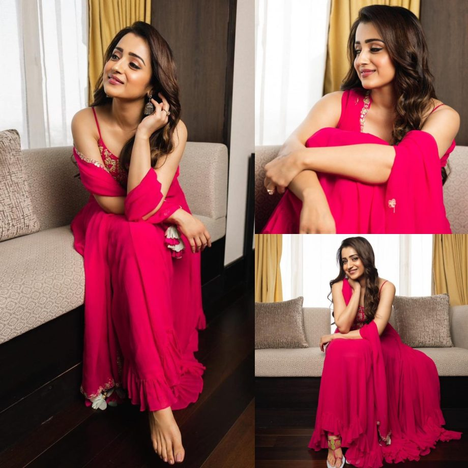 Trisha Krishnan takes the stage in a stunning embroidered pink Anarkali outfit worth Rs 45000. Her asymmetrical kalidar is embellished with elaborate gota and threadwork and is matched with precisely tailored trousers and an elegant dupatta that features artisanal handwork. trisha exudes pure elegance with her long hair and little makeup, making the ensemble a must-have for anyone seeking royal refinement.