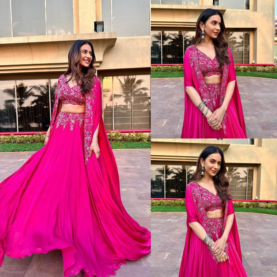 Rakul Preet Singh looks stunning in a magenta embroidered top with an embellished cape and matching skirt. Her mid-parted long wavy hairstyle and minimal makeup finish the image, displaying a wonderful combination of elegance and simplicity in ethnic clothes.