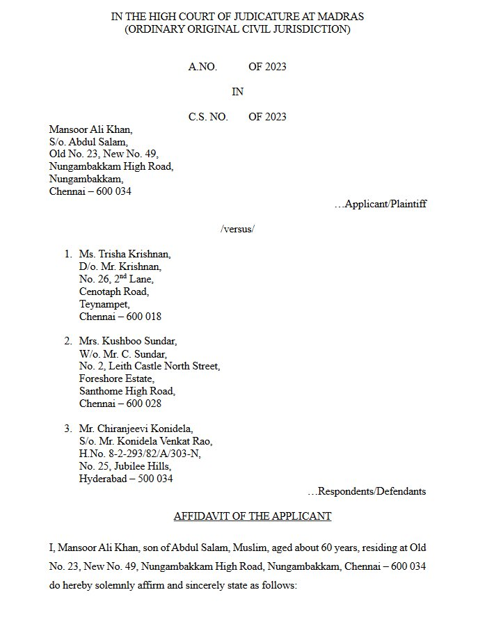 His legal case centres on not making personal remarks about trisha, but rather on the terrible parts he has played in films. The letter further states that chiranjeevi lives in Hyderabad, which is beyond of Chennai's jurisdiction. The entire fued started after Mansoor ali Khan received massive backlash for his comments against trisha and many celebrities, including chiranjeevi Konidela came in support of her to condemn the remarks.