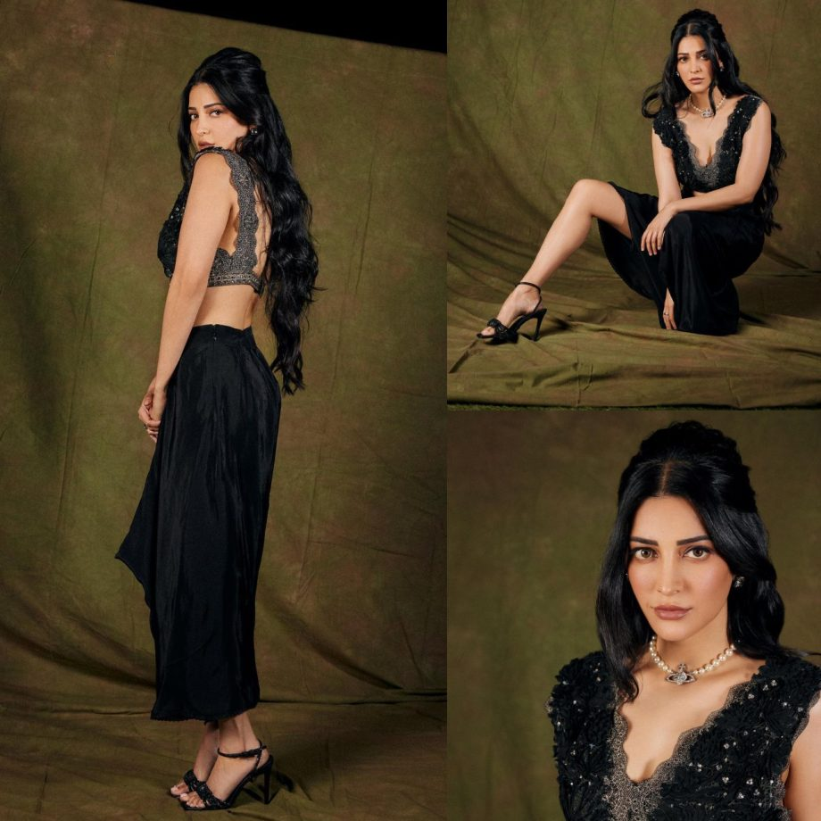 Shruti Haasan recently ignited the fashion world with her timeless grace. In a captivating black co-ord outfit, the actress demonstrated not just her love of fashion but also her artistic command of it. Every detail of her outfit, from the silver-embellished top to the satin skirt, screamed glamour and grace. Let us embark on a fashion trip to uncover the mystery constructed by shruti haasan in her mesmerizing black costume.