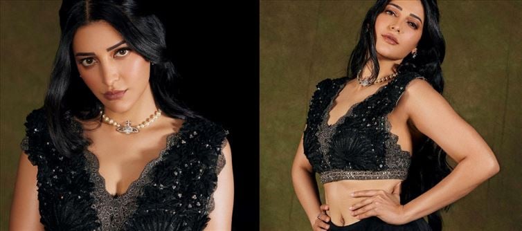 Shruti Haasan recently wowed her fans with a series of stunning photos of herself dressed in a stunning black co-ord outfit. The actress wore a sleek skirt and a sleeveless shirt decorated with silver embroidery, demonstrating her enduring affection for the classic tone. Shruti's attire, courtesy of JADE by monica and Karishma, radiated refinement and sophisticated appeal. The flowing satin skirt complimented the beautifully decorated blouse perfectly, providing a perfect combination of glitz and elegance.
