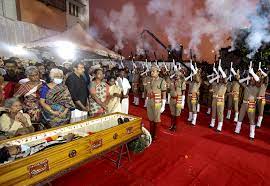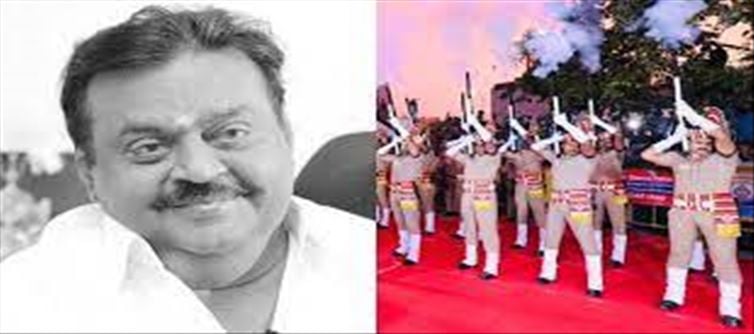 Actor and DMDK founder Vijayakant was given full state honours at his funeral on friday night at the party headquarters in Koyambedu. He saluted with 72 guns. The funeral procession went slowly, gathering at Island Grounds in the afternoon. Fans and partygoers crowded the whole 12 km stretch. Chants of "Long Live Captain" were heard.