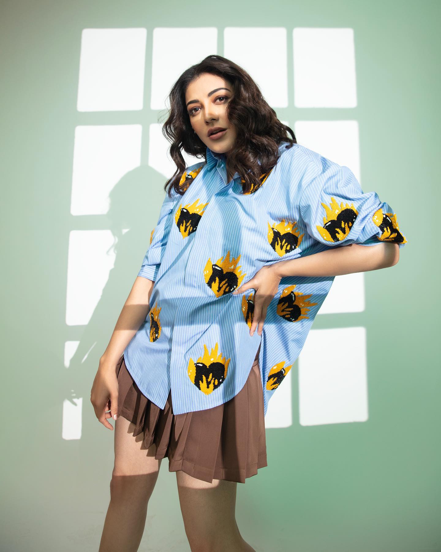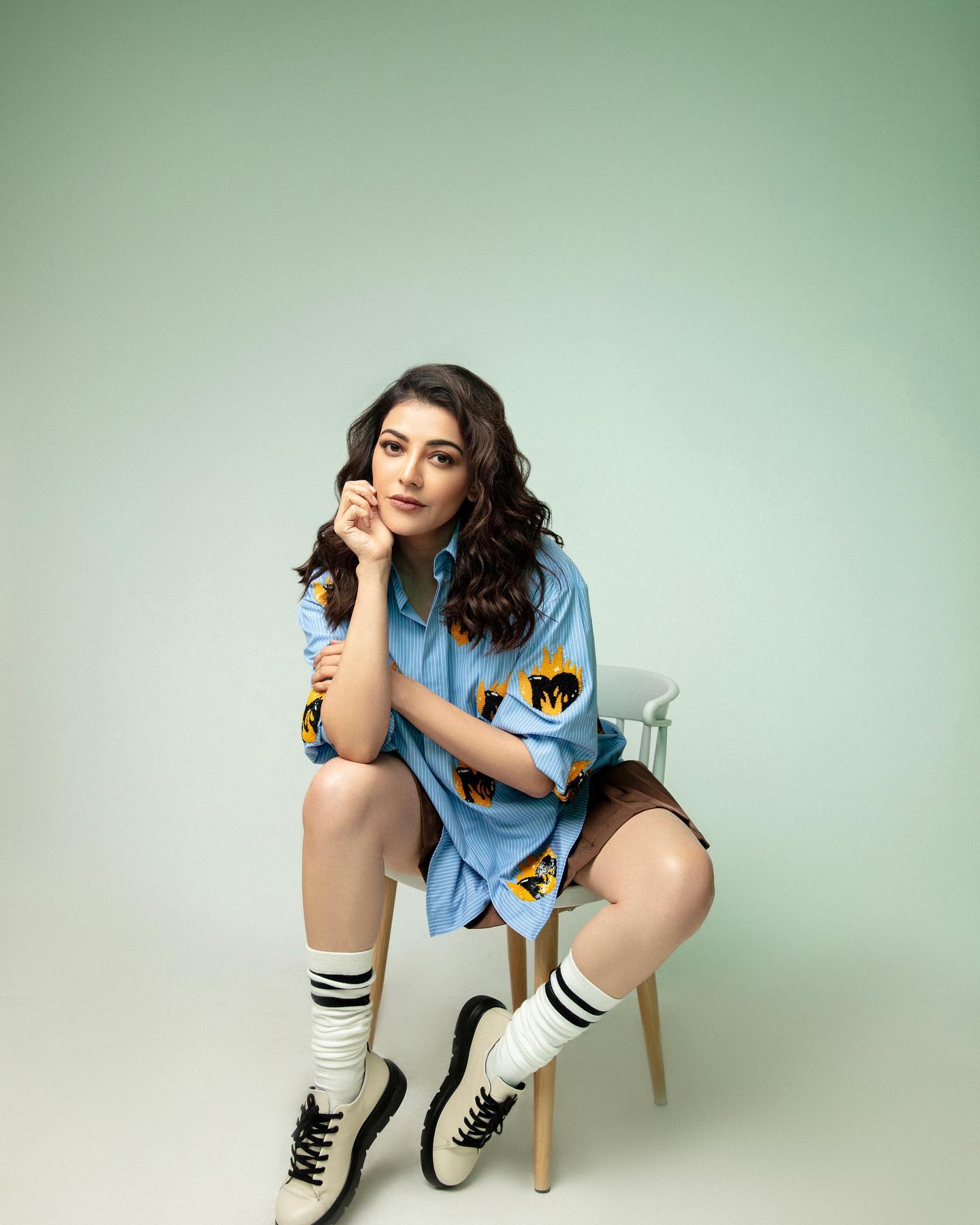 Kajal is seen in the photos sporting a sky-blue patterned top with a brown little skirt. She complimented her outfit with white stockings and stylish brown shoes and looked stunning. She posed for the camera with her wavy hair open. Kajal Aggarwal's makeup included neatly drawn brows, contoured cheeks, blush, a nude lip tint, mascara on the eyelashes, and brown eyeshadow. She posed in front of a pastel green wall. The photographs are becoming viral on the internet.