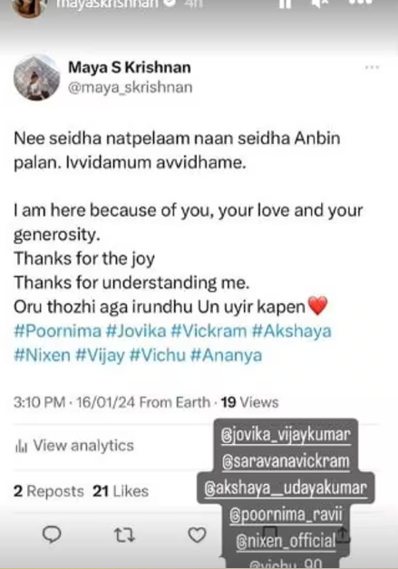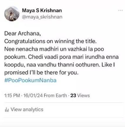 Also on another note, Congratulations dear Archana. For you winning the title. "Flowers will bloom in your life as you wish... If the plant seems to wither, what do you call me? I will come and water you. I swear I will be with you," she posted. "All the friendships you have made are the fruit of my love. This is also the same..! I will always be worthy of your friendship. Thank you for making me happy, thank you for understanding me, I will save your life by being a friend, she has tagged Akshaya, Nixon, Vijay Verma, Vichu, Ananya, Poornima, Jyothika, and Vikram." , Some of the bigg boss fans... can't accept that maya has left her with the title and are saying that she is throwing a tantrum at Archana, forgetting that bigg boss is a game. Similarly, it is noteworthy that archana has really won the hearts of the people and is retaliating that she has won the title.