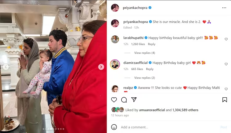 Priyanka posted a series of cute photos on her official instagram account. Priyanka's mother, Madhu Chopra, was also present to seek blessings from the Lord. priyanka captioned the photos, "She is our miracle." And she is 2 (emoji of a crimson heart and folded hands)." Check out the post here.