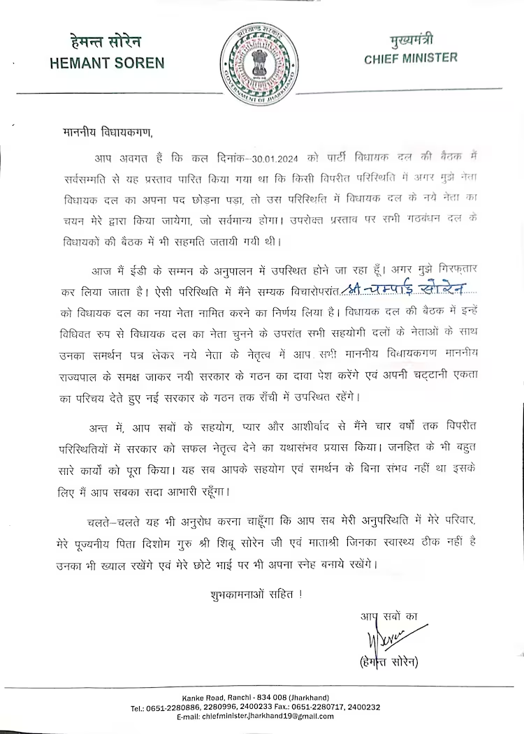 In a letter to the MLAs of the Opposition india group on Wednesday, hemant Soren stated, "If I am asked to step down from my position as legislative party leader, I will choose the new leader." As the letter was addressed, Soren stated, "I will appear before the Enforcement Directorate for questioning today." "If I am arrested, Champai Soren will become the legislative party's leader."