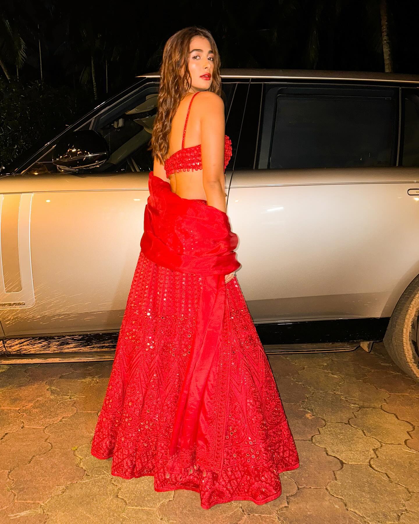 The lehenga included a bustier top and a handwork skirt that appeared ethereal. The Cirkus star chose dewy makeup and a strong red lip color to match the lehenga. pooja looked stunning with kohl eyes and a disheveled hairstyle. She completed her ensemble with kundan earrings and a golden kada, which only complemented her appearance.