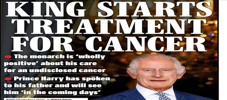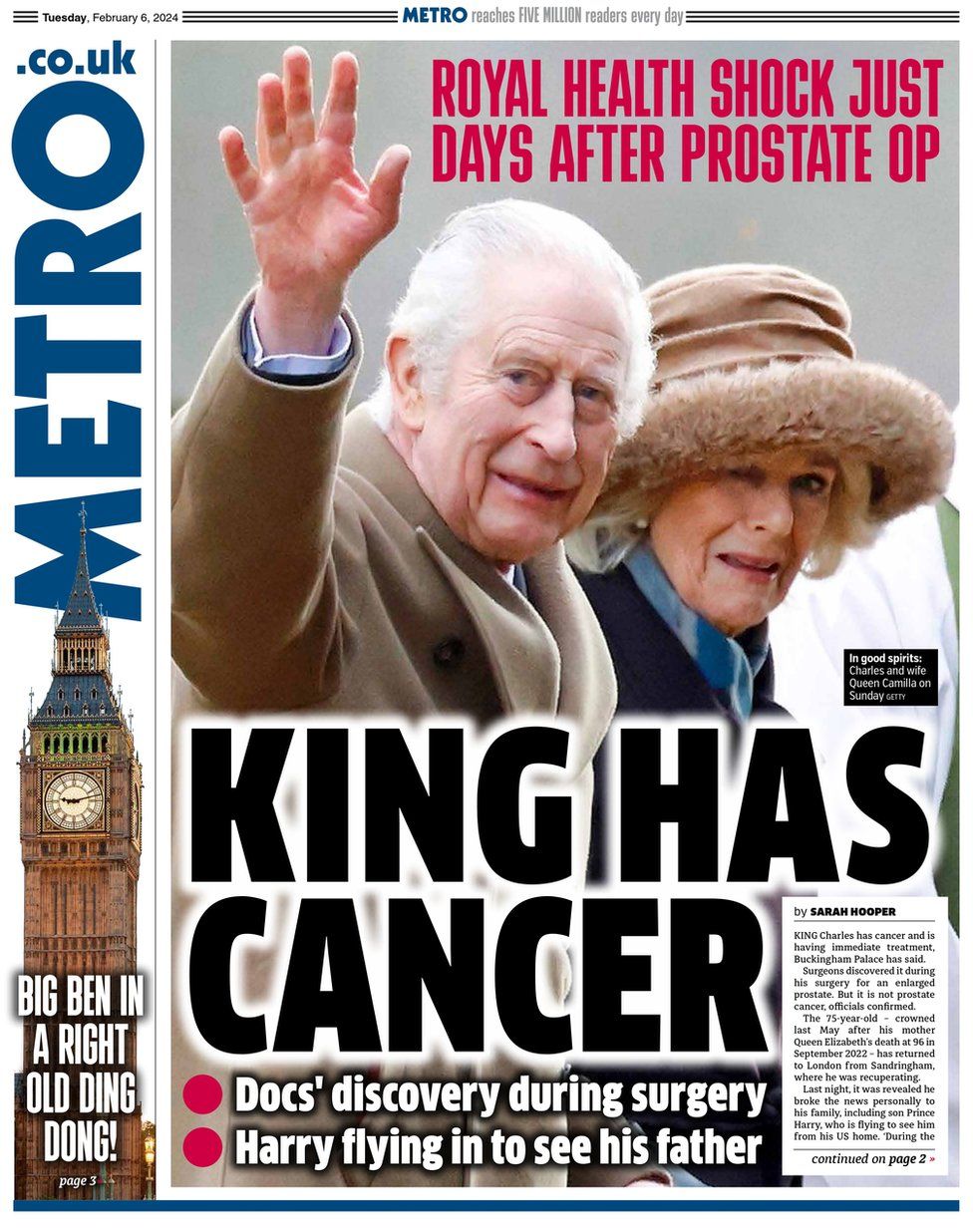 Naturally, news about the King's health dominates Tuesday's UK front pages. The title "King: I have cancer" is very striking on The Sun. The Mirror describes it as a "shock" and notes that the diagnosis was made as a result of his most recent prostate surgery.