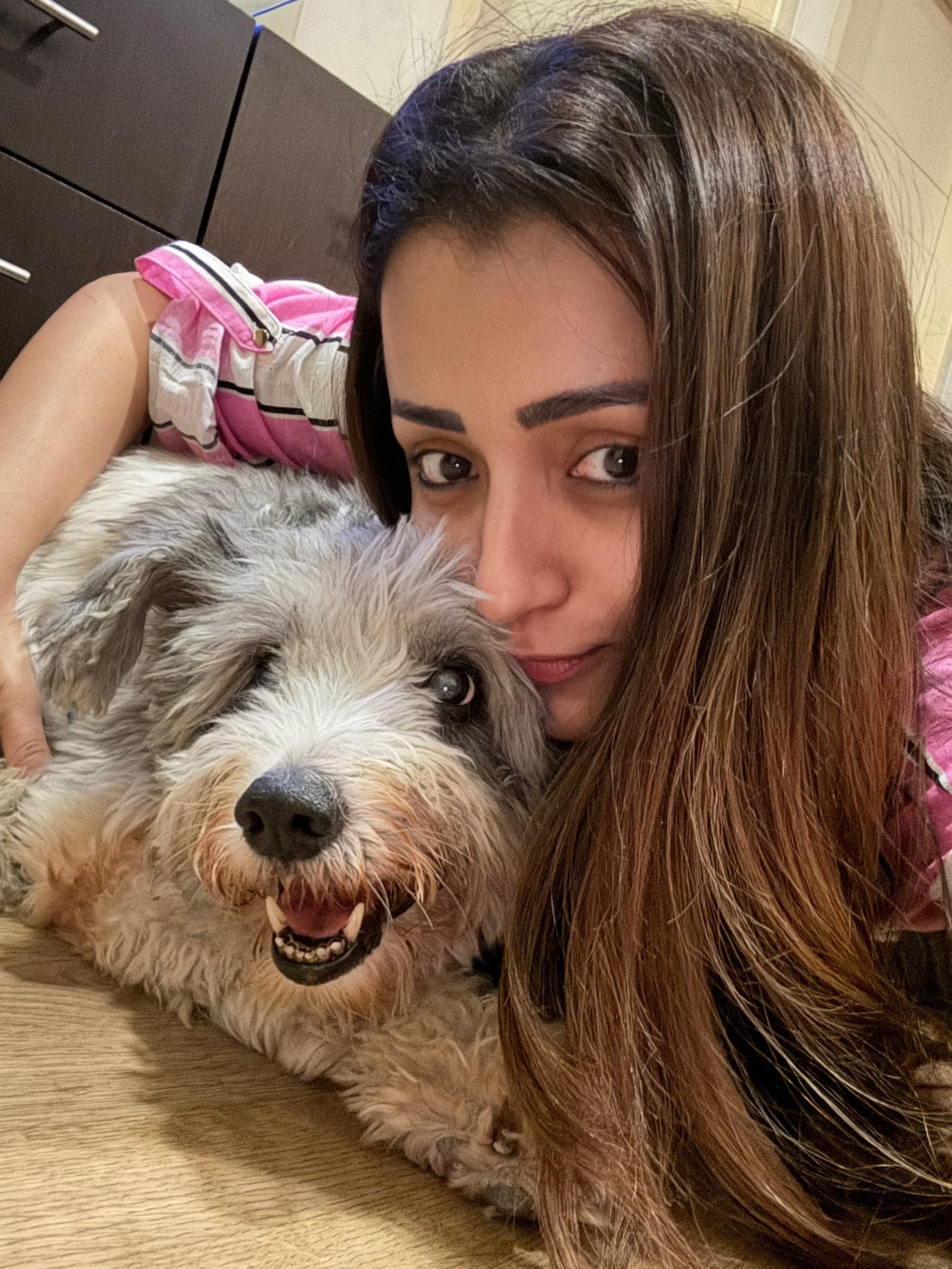 The enduring tamil actress trisha krishnan, who is renowned for both her excellent fashion sense and her stellar performances, has released a batch of adorable photos with her puppy.
