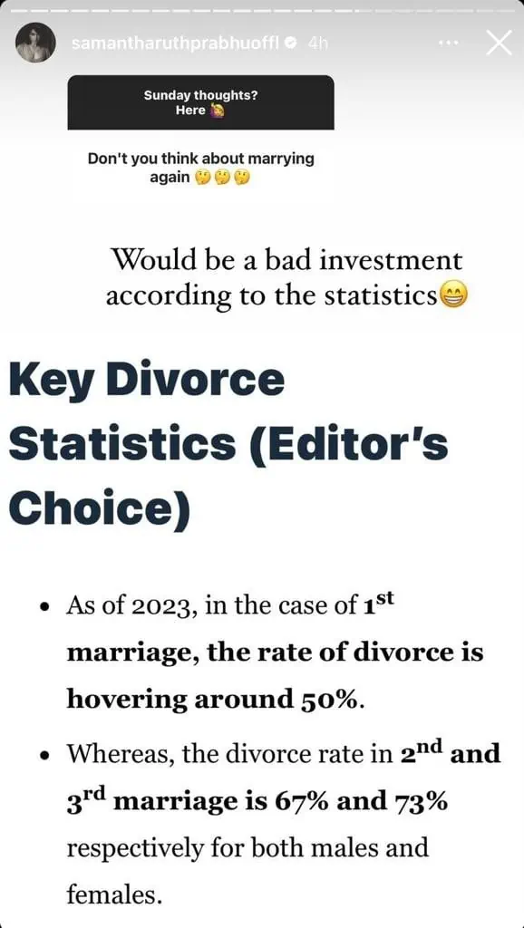 Samantha recently talked about her second marriage in a social media exchange with her followers, and her remarks about it are currently going viral. samantha engaged with fans on various questions during the instagram Q&A. When one fan asked about the possibility of a second marriage, she shared a screenshot highlighting divorce rates and humorously responded, “Would be a bad investment according to the statistics (laughing emoji).”