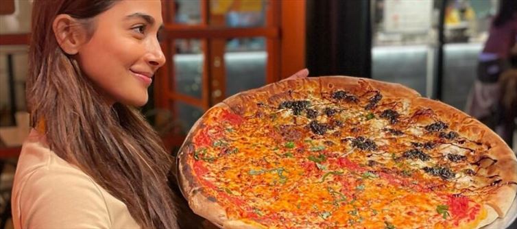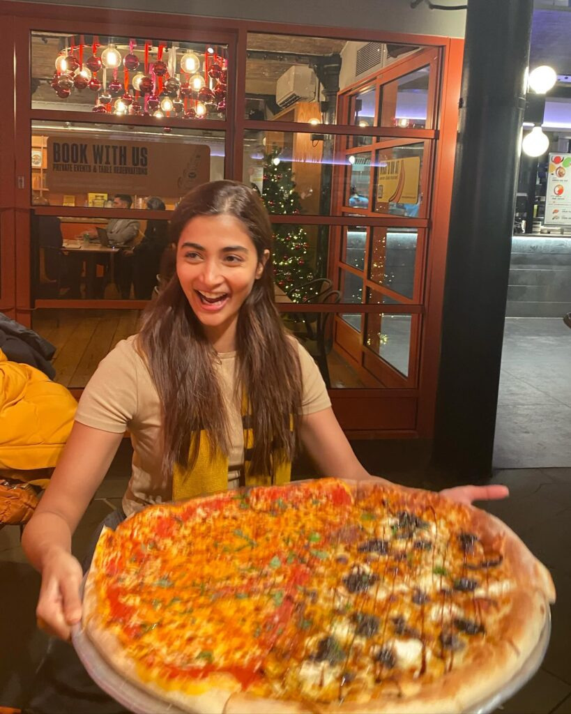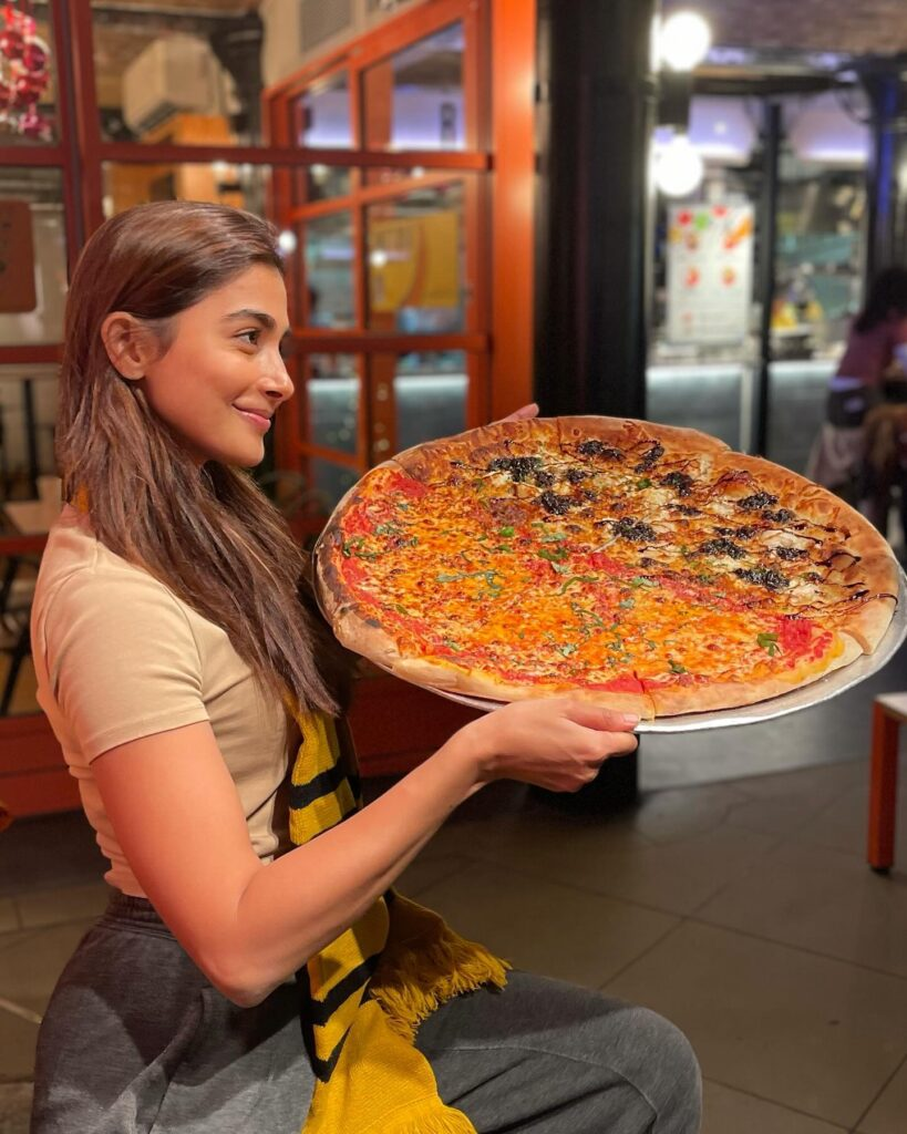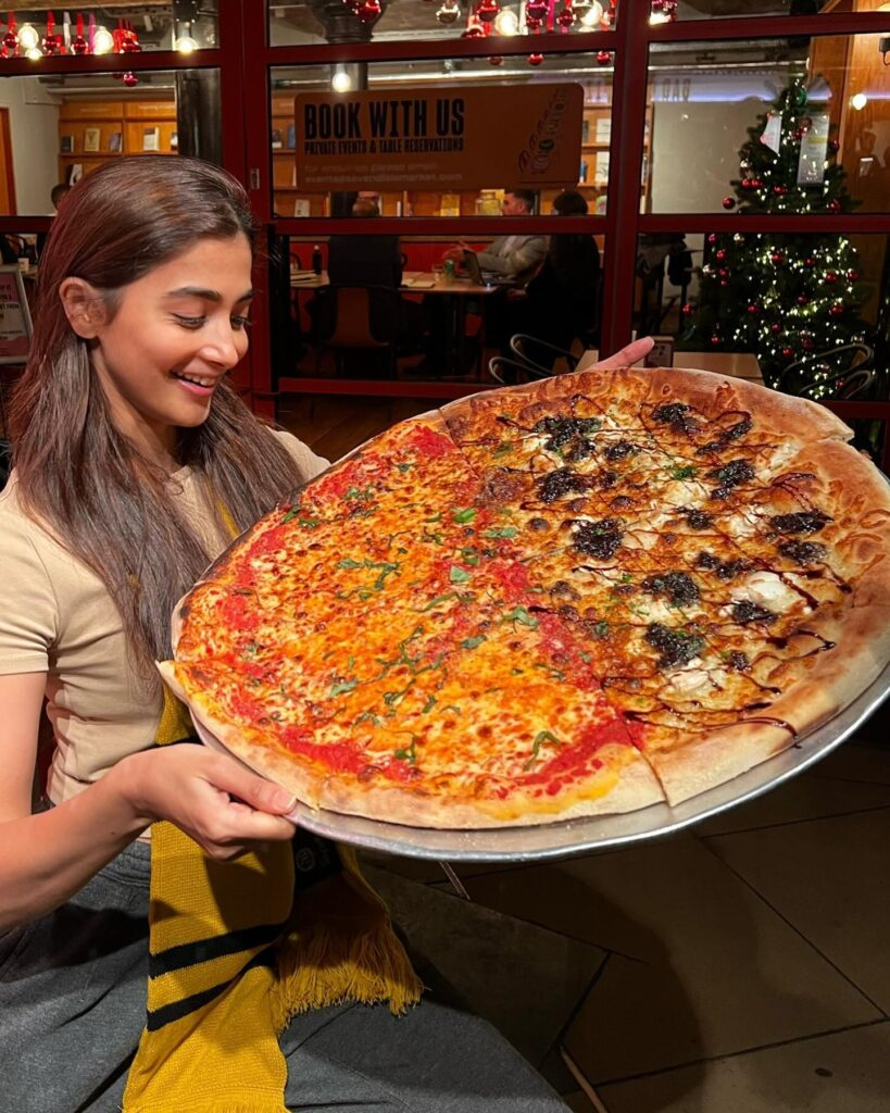 With her hair falling freely and outfitted in a loose cream shirt and grey trousers, pooja confidently embraced the laid-back attitude. This humorous image reminds us that even those on diets want to indulge in their favourite foods, and World pizza Day is the ideal justification for doing so!