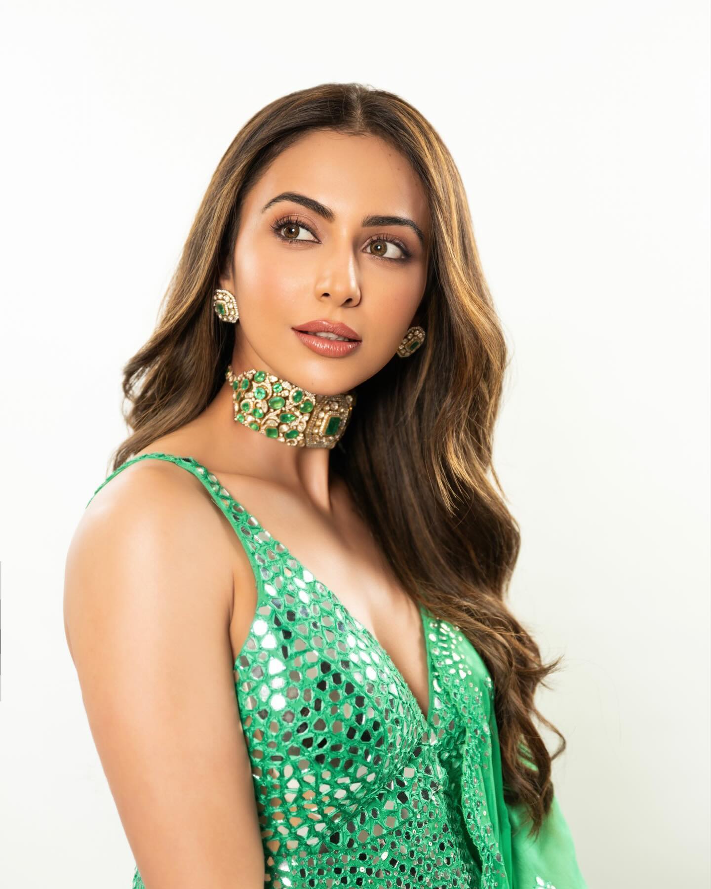 In a green sharara featuring thin straps and mirror embroidery, rakul preet singh looked stunning. She accessorised her green ensemble with kundan jewellery, including a bracelet, huge studs, and a choker, and she wore her hair in lush waves. rakul Preet captioned her instagram photo on Friday, "Mai koi aisa geet gaun? (Shall I sing such a song)," a line from Shah Rukh Khan's smash blockbuster film Yes Boss.