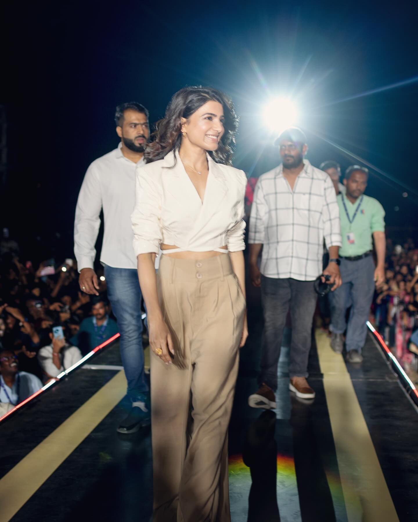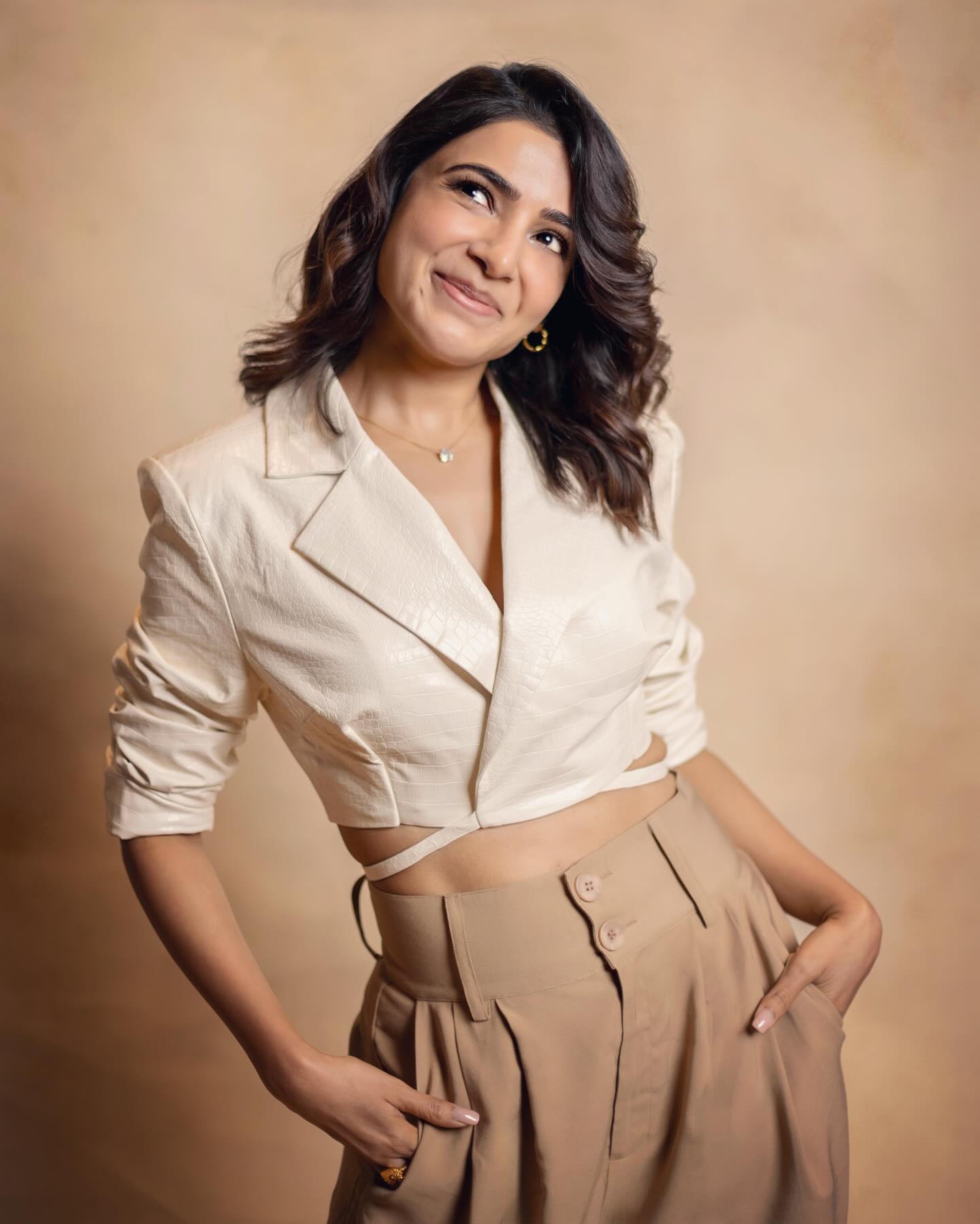 Samantha Ruth Prabhu also gave us a sultry but elegant look recently that had us all in awe. The actress, dressed in a calming cream-coloured cropped jacket, radiated charm and grace. The stylish yet formal outfit had a lapel neck and folded sleeves, and a sophisticated tie knot accent at the back gave her outfit some flare.