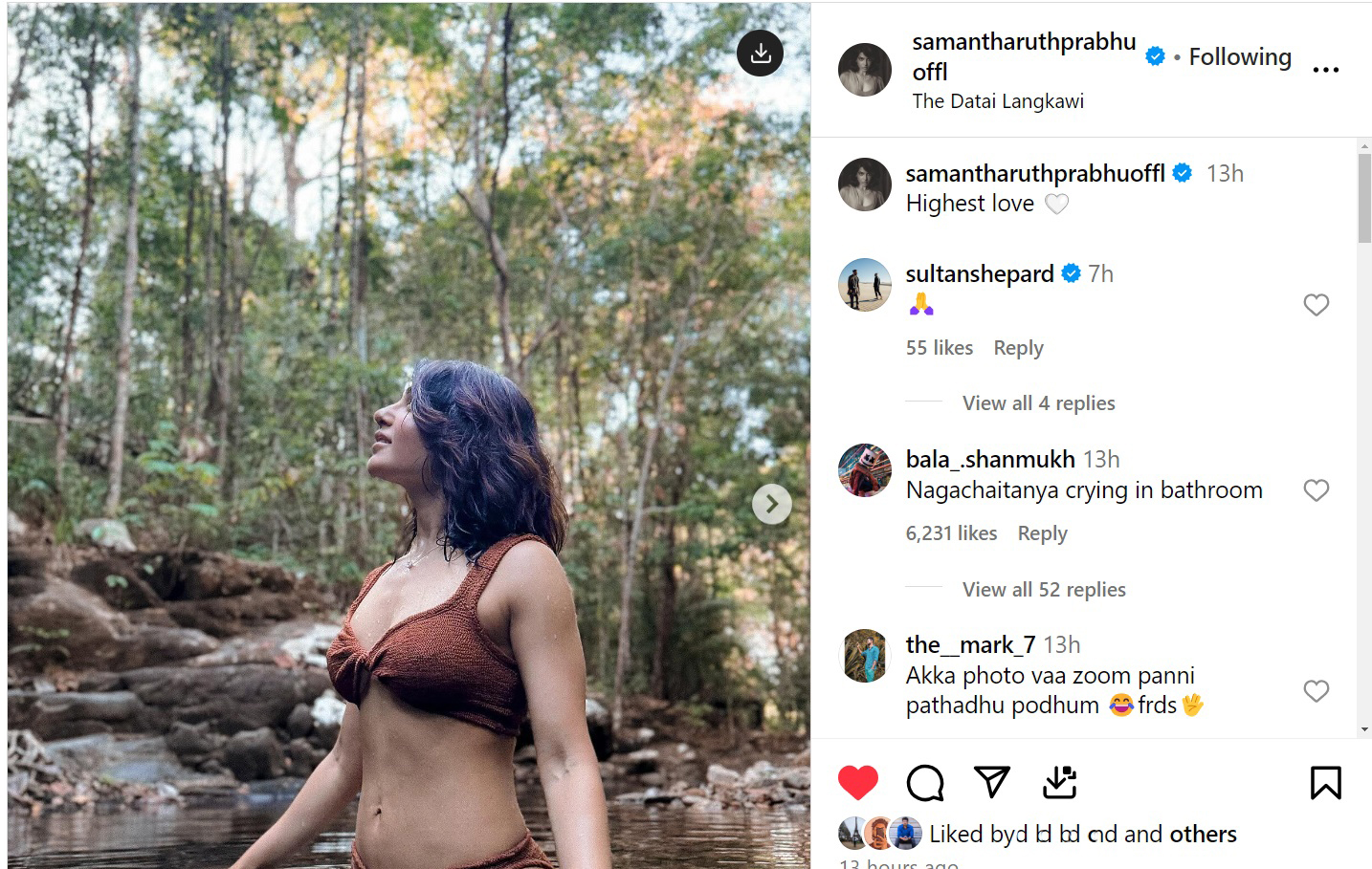 As seen in the pictures below, samantha proudly displays her toned physique while posing for the camera in the lovely company of nature. The actress also posted a few more images from her retreat, including shots of the resort and yoga sessions. As you can see above, the netizens dragged Samantha's Ex-Husband naga chaitanya and one particular comment got more than 10K likes. The comment read, "Nagachaitanya crying in bathroom"