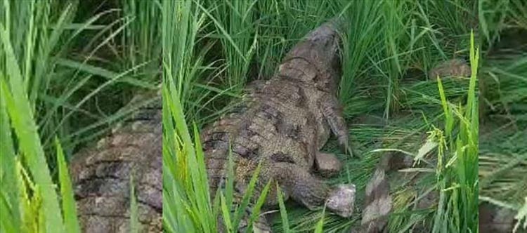 On Thursday, february 29, a crocodile invaded farmlands close to Muthyalamma village in Tripuravaram mandal of nalgonda district, Telangana. Since crocodiles don't often occur on telangana farms, the farmers were alarmed to see one splayed out on their property. The crocodile will be captured by forest officers and released into the waters of nagarjuna Sagar.